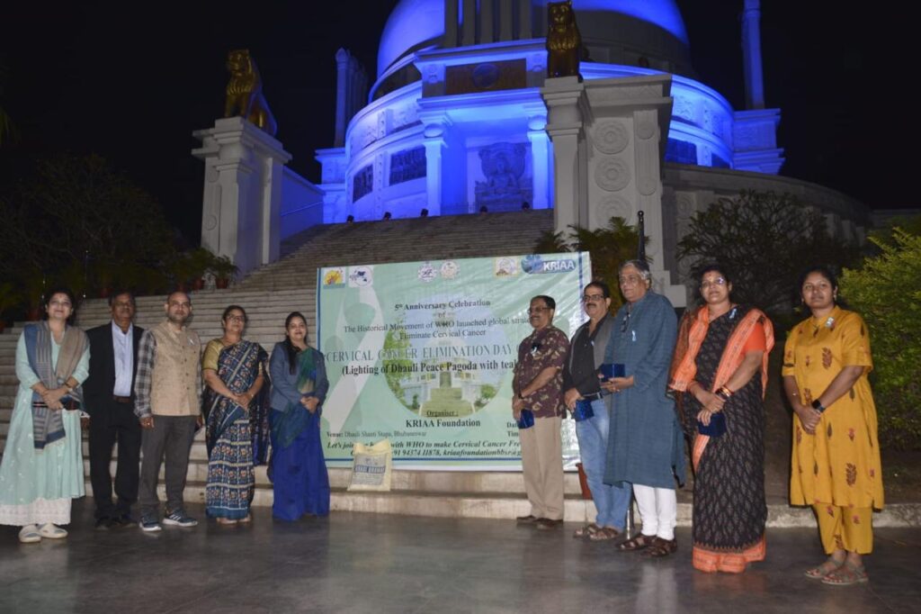 New Delhi/Bhubaneswar, India – On the 5th Anniversary of the World Health Organisation’s Global Strategy to Eliminate Cervical Cancer, KRIAA Foundation commemorated the occasion with a poignant event at the historic Dhauli Hills, illuminating the Dhauli Shanti Stupa in teal blue – a symbol of awareness, hope, and collective action against cervical cancer.